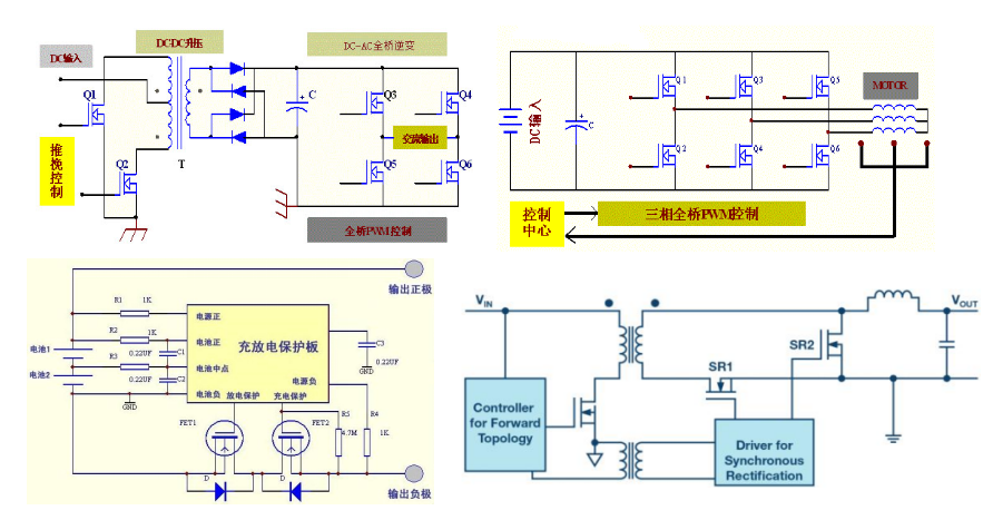 (1)儲(chǔ)能電源/太陽能控制器/逆變器/UPS等電源的DC-DC升壓結(jié)構(gòu)使用推免結(jié)構(gòu)或者半橋、全橋結(jié)構(gòu)。